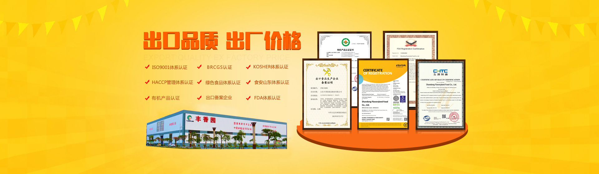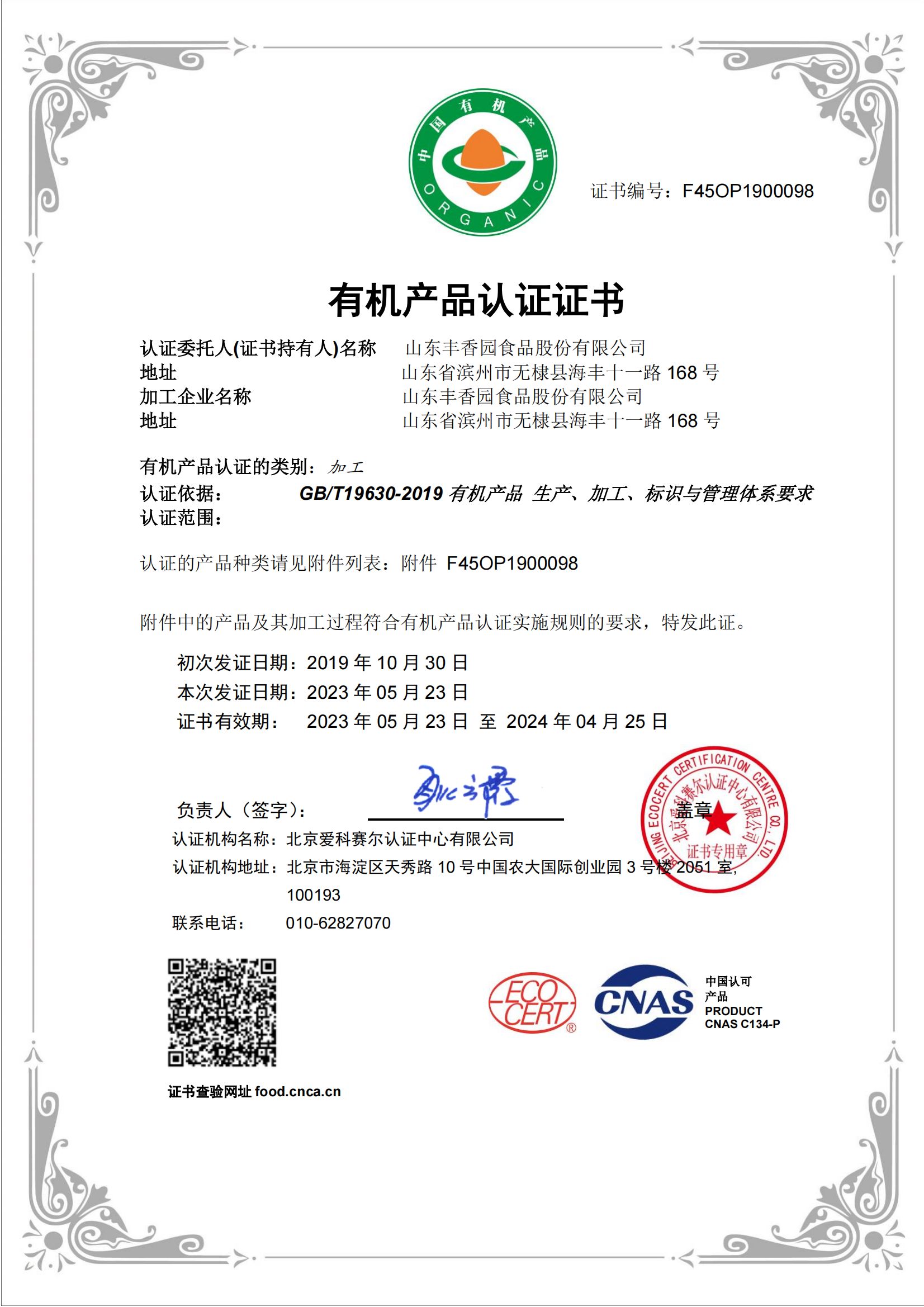 公司獲得HACCP國際質(zhì)量體系認證、ISO9001:2015質(zhì)量管理體系認證,產(chǎn)品獲得美國FDA認證、美國、歐盟有機食品認證、英國BRC體系認證、A級綠色食品認證、GB國標有機食品認證。